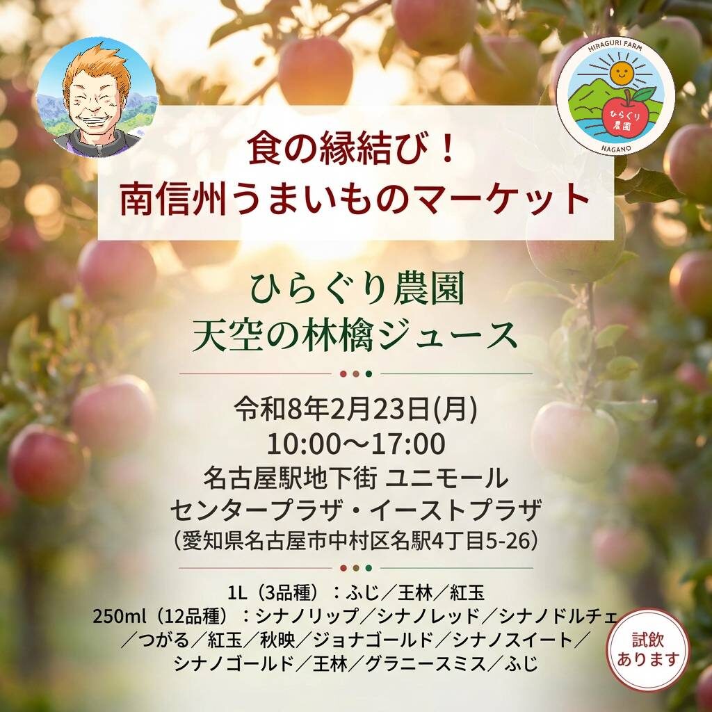 また、りんごジュースなどの加工品も用意しておりますので、ぜひ一度、南信州の大自然が育んだ味わいをお楽しみください。