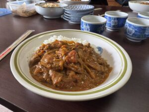 そして昼は園主特製【鹿肉とショウゲンジ茸のスパイスカレー】を食べてもらいました。鹿肉は3日ほどかけて血抜き&煮込みをして臭みと硬さを無くしあとはスパイスでカレーにさせて頂きました。